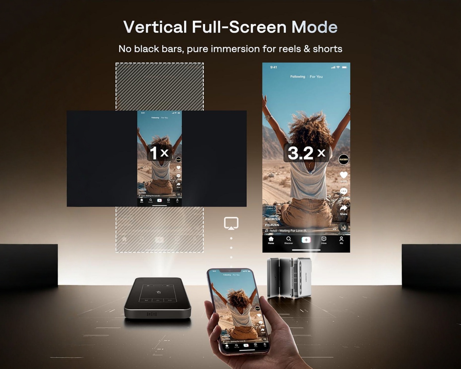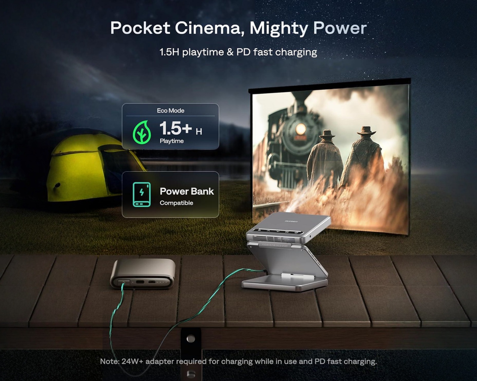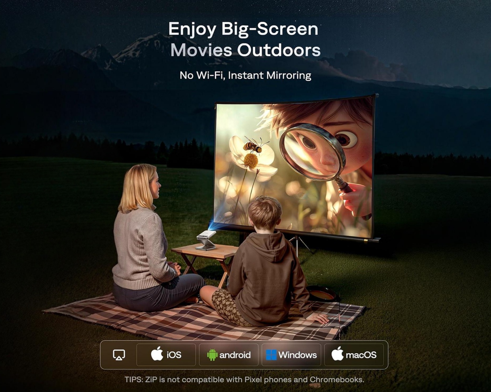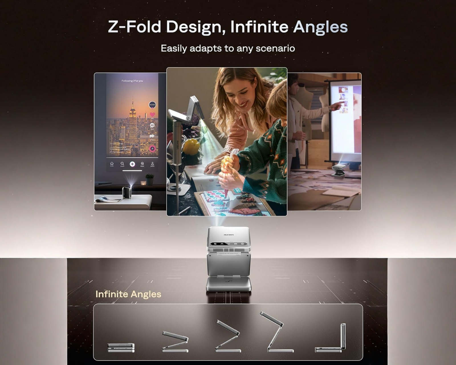 Aurzen ZIP Tri-Fold Portable Mini Projector is a unique and versatile projector from Aurzen that combines portability and high quality. This tri-fold projector offers a resolution of 720p and is designed to fold into a compact size, making it easy to take anywhere. Its built-in battery provides up to 1.5 hours of playtime and supports quick charging via USB-C, allowing you to enjoy movies and presentations on the go.The projector is built with advanced DLP technology which delivers vivid colors and high image quality, perfect for displaying detailed images and videos. The device uses a 5000mAh battery and offers instant mirroring without the need for Wi-Fi, making it compatible with various devices such as iOS, Android, and Windows. The ZIP Tri-Fold also features an intelligent automatic focusing that works without delay, ensuring a smooth user experience. It is perfect for both home use and professional presentations.