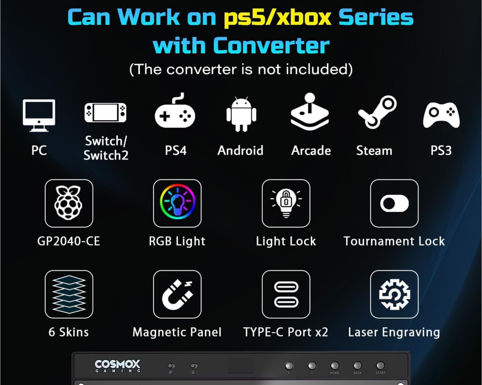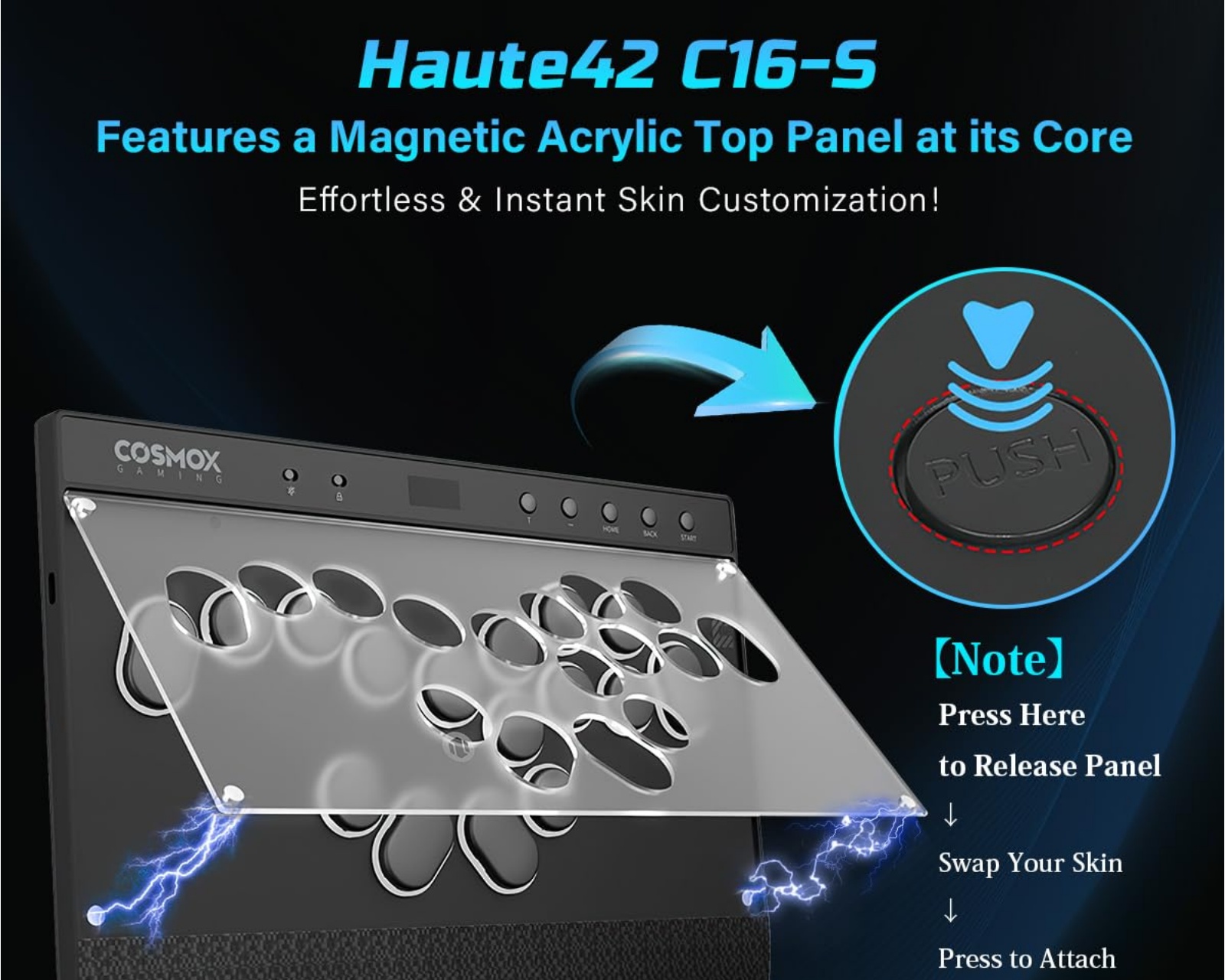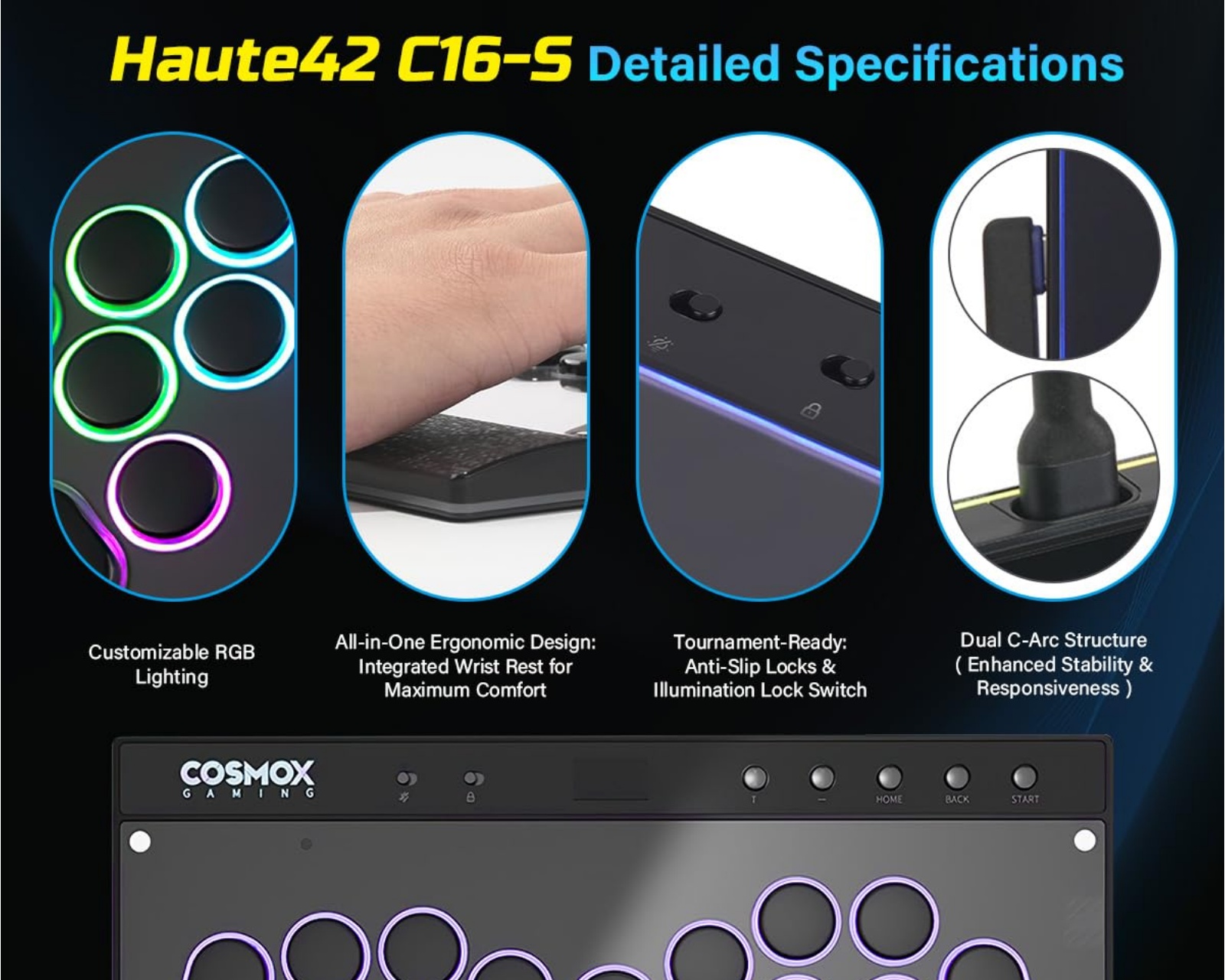 Haute42 C16-S Arcade Controller is a revolutionary game controller that combines modern design with advanced technology. With a unique magnetic panel concept, the user can easily customize their gaming experience without the need for screws.The ergonomic design of the C16-S and RGB ring lighting around the buttons provide both visual appeal and practical functionality. The package also includes artwork templates for personalization as well as a tournament lock to prevent unwanted presses during intense gaming sessions. With ultra-low latency of less than 1 ms and support for firmware updates, it guarantees a stable and reliable gaming experience.