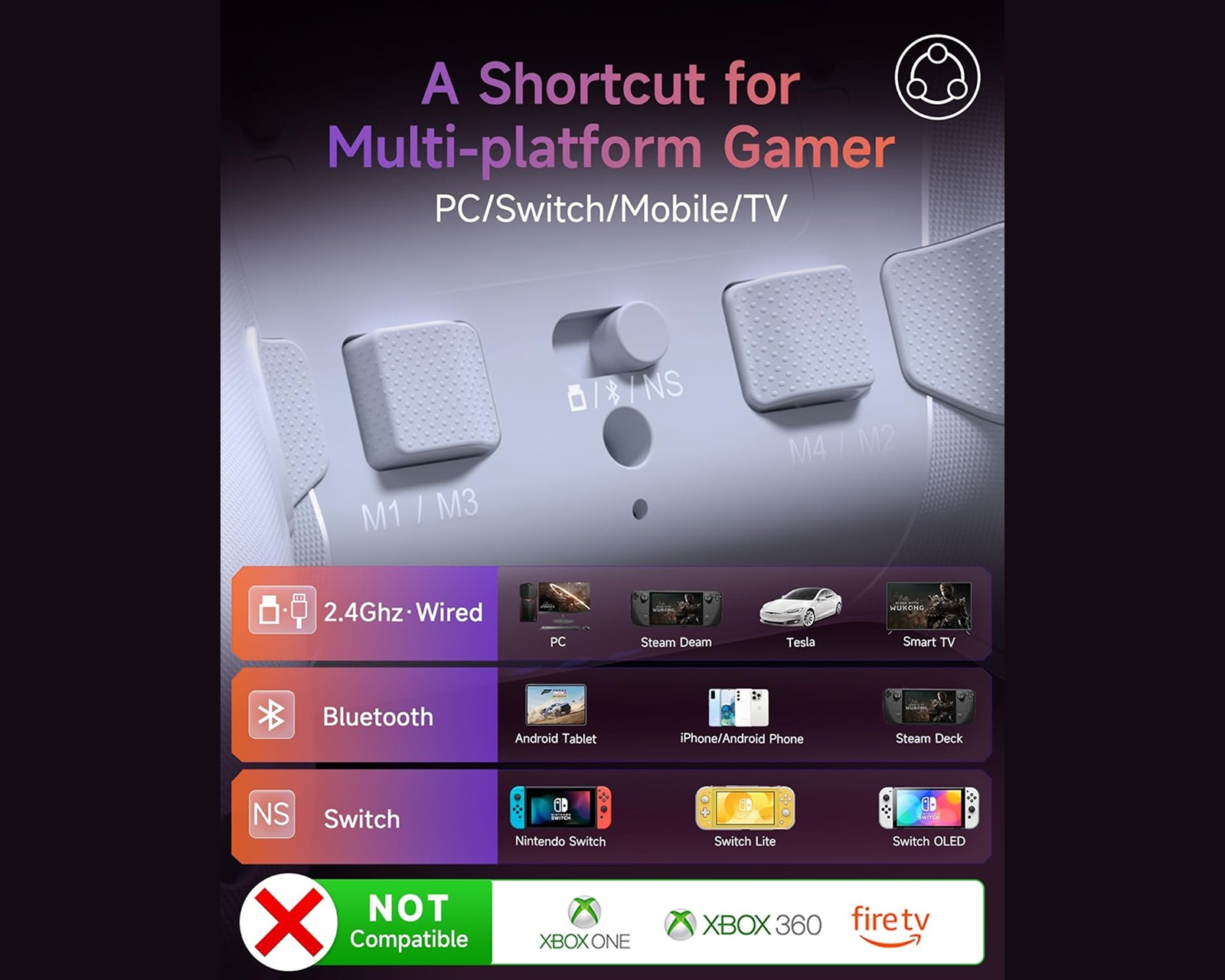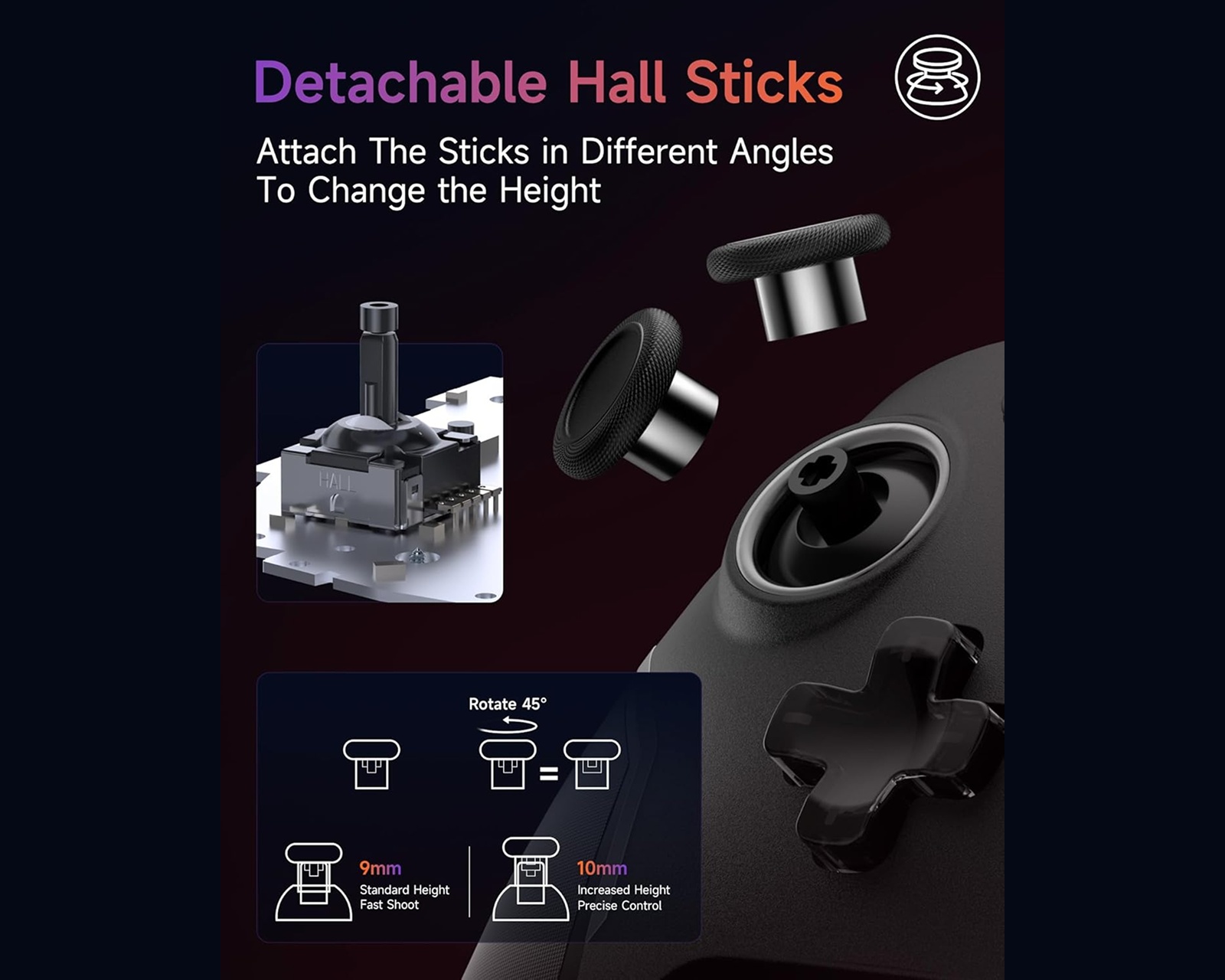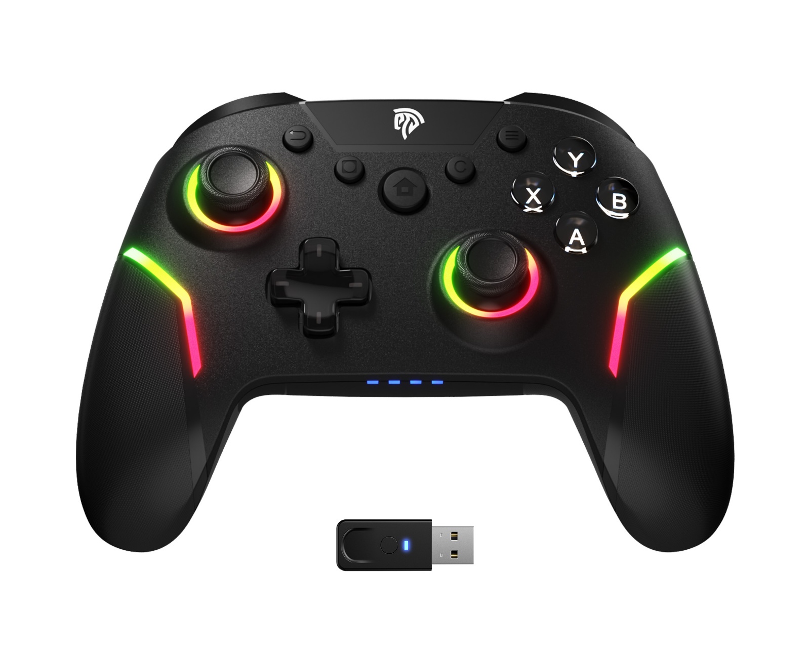 X20 Wireless Controller PC/Switch from EasySMX delivers advanced functionality and mobility. This controller is designed for use with Windows PC, Android, and Switch with a 1000Hz polling rate and detachable Hall sticks for a customized gaming experience. Its RGB lighting allows for a tailored visual experience.The controller's build quality is high, focusing on durability and ergonomics, emphasized by the mechanical buttons that provide clear feedback with each press. With support for 6-Axis Gyro technology, the controllers enable precise motion control across multiple platforms. The detachable Hall sticks are adjustable in angle and height to suit different play styles, while the fast 1000Hz polling rate ensures that all commands are registered without delay. The device supports concurrent connections both wirelessly and via cable, providing flexibility and versatility.