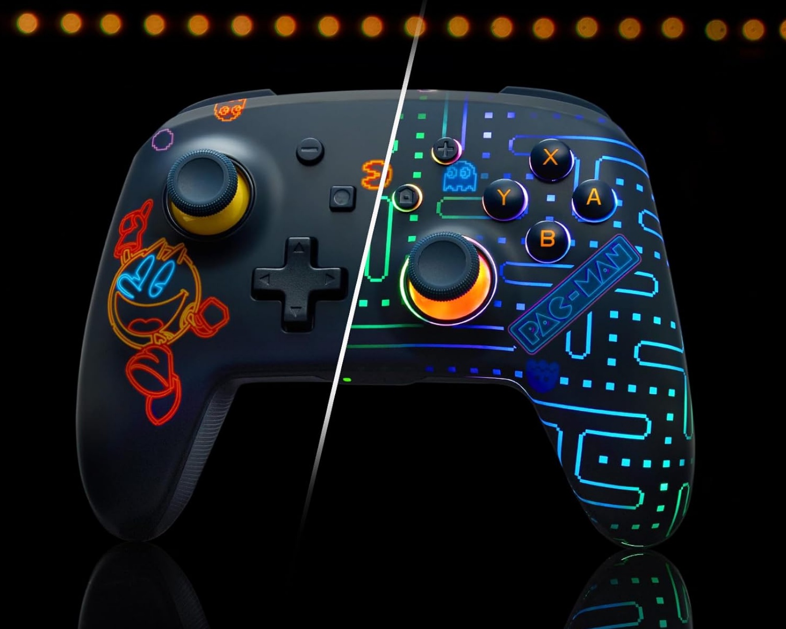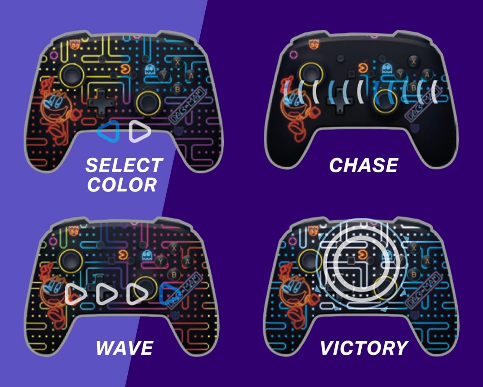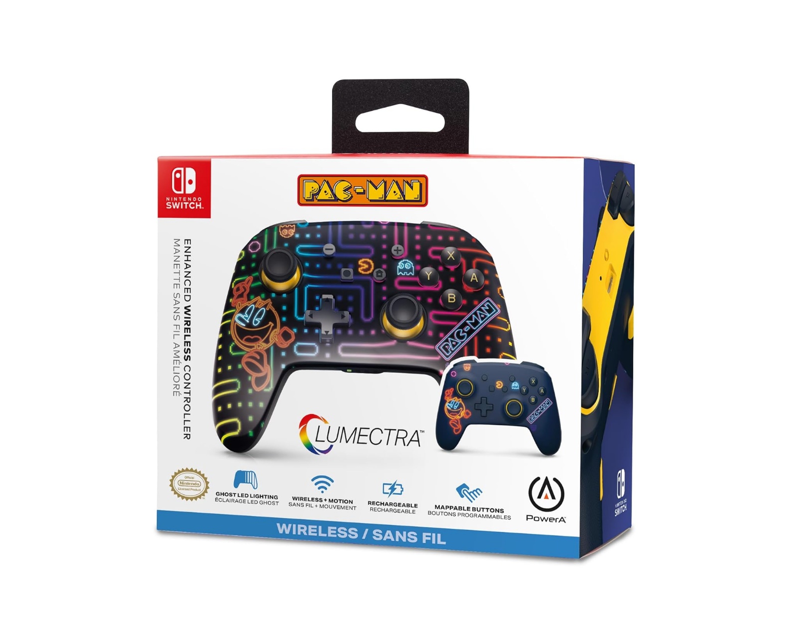 Enhanced Wireless Controller for Nintendo Switch - Pac Man (Neon Arcade) is a game controller from PowerA, designed for use with Nintendo Switch, Nintendo Switch OLED Model, and Nintendo Switch Lite. The controller features built-in RGB LED lighting that highlights a hidden PAC-MAN pattern and has four unique lighting modes. Additionally, it offers advanced gameplay buttons that can be programmed on-the-fly for improved performance.The controller is equipped with a rechargeable battery that provides up to 10 hours of playtime on a single charge. The included 3-meter USB-C cable allows for simultaneous play and charging. Thanks to the wireless system, users can play freely on their console. The controller also includes motion sensors for more responsive gameplay and intuitive in-game navigation. The ergonomic design features a familiar layout with textured grips on the back and textured analog sticks.