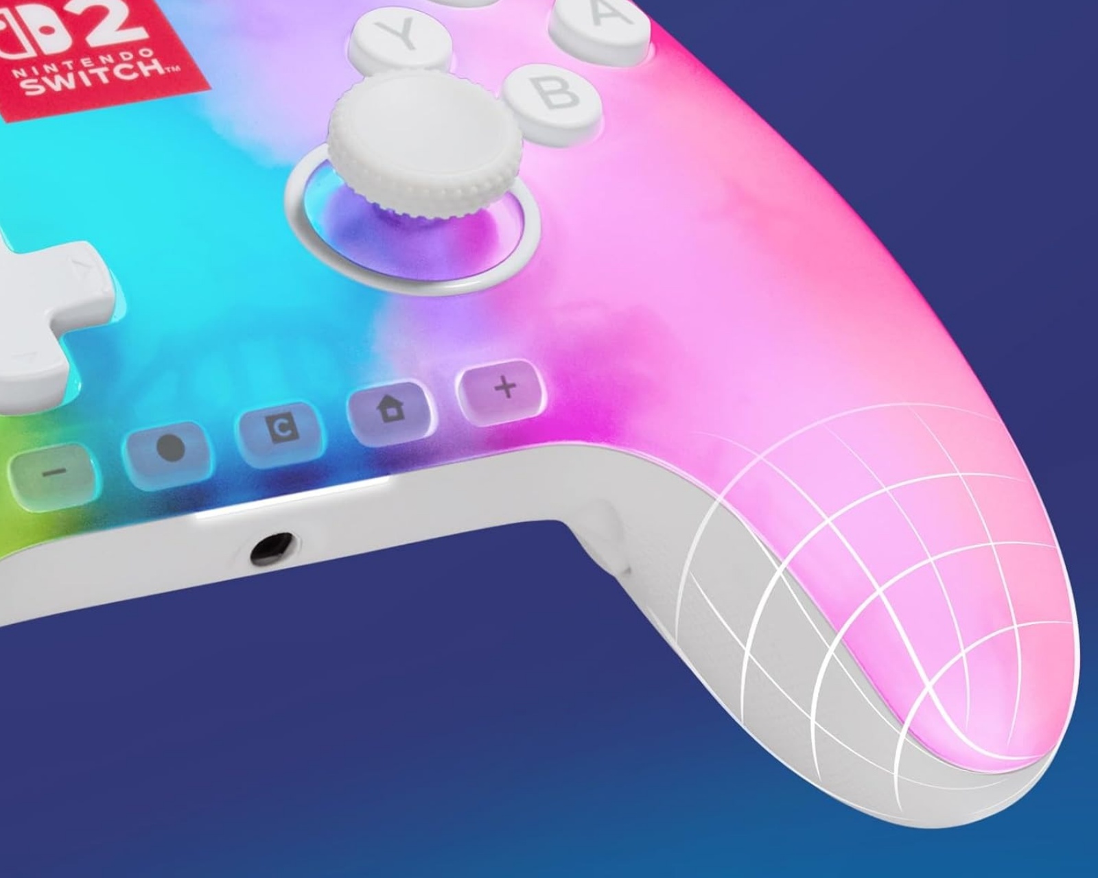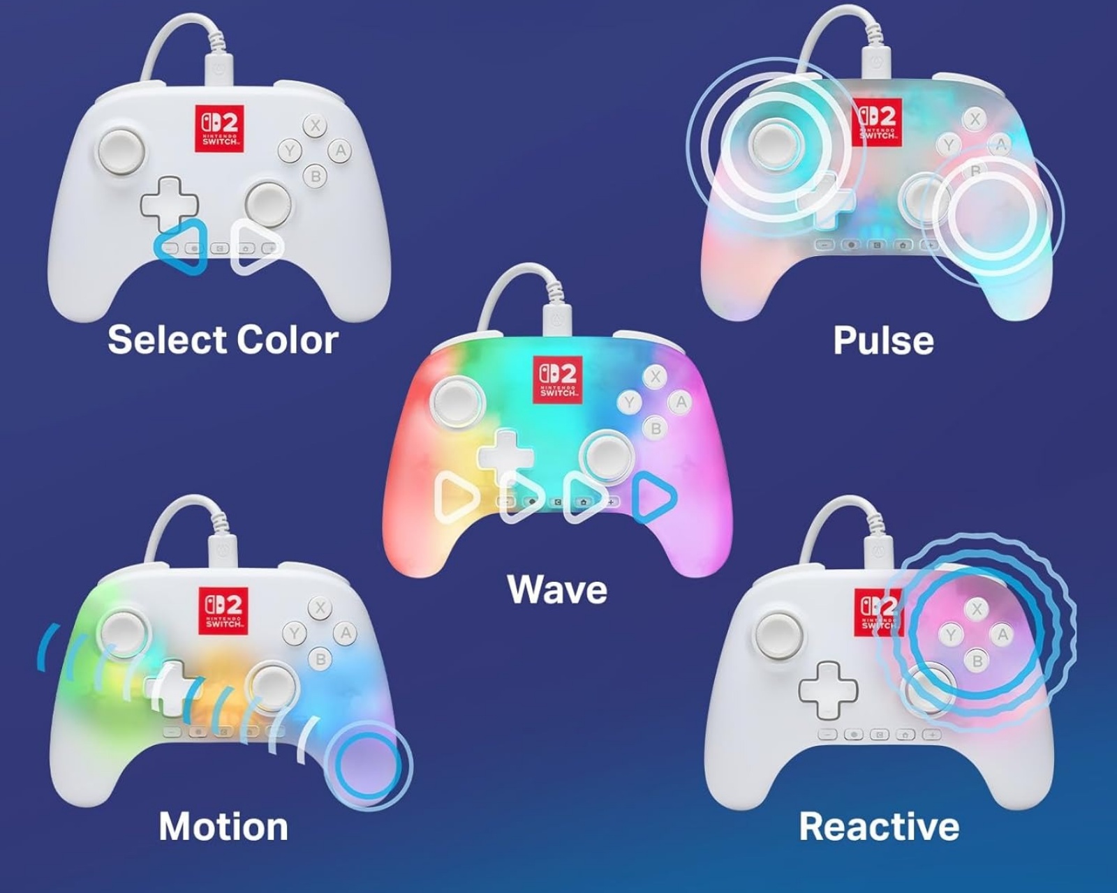 Advantage Wired Controller for Nintendo Switch 2 is a game controller from PowerA that offers RGB lighting and mappable buttons. It is officially licensed and promotes a smooth gaming experience with Hall effects, making it suitable for both casual and more serious gamers. The controller also emphasizes comfort and long-term use.The controller is built with Hall effect modules that use contactless magnetic sensors in the thumbsticks to provide a more precise and durable feel. The advanced game buttons can be mapped on the fly without looking over system settings. The GameChat feature is easily activated via the C button. The controller also has audio controls for adjusting headset volume, a mute function for the microphone, and EQ modes, providing a deeper audio experience. It is lightweight and ergonomically designed to fit well in the hand during long gaming sessions. With a detachable 10-foot long USB-C cable, gamers can play uninterrupted without battery issues. Additional features include built-in anti-friction rings for smooth thumbstick navigation and a 3.5 mm audio output for headsets.