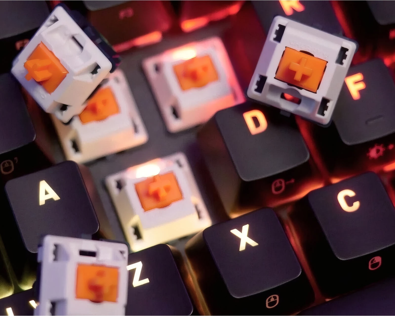 CHERRY MX FALCON is a keyboard switch from CHERRY that offers a heavy tactile feel. Designed to provide bold feedback and a satisfying tactile feel, this switch is ideal for those who have high demands for precision and control when typing. With an actuation force of 50 cN and a total travel of 3.5 mm, it satisfies both typists and enthusiasts.The switch housing is made of high-precision plastic polymer, ensuring an accurate fit and functionality. CHERRY MX FALCON uses a long-pole design to optimize the pressure sensation and sound. The components are factory-lubed to deliver a pleasant actuation point without click sounds. Additionally, it features a unique spring-centering system that contributes to a smooth and responsive function. Thanks to its design, it is also self-cleaning and resistant to dust and dirt, making it durable over time and capable of handling over 50 million keystrokes.