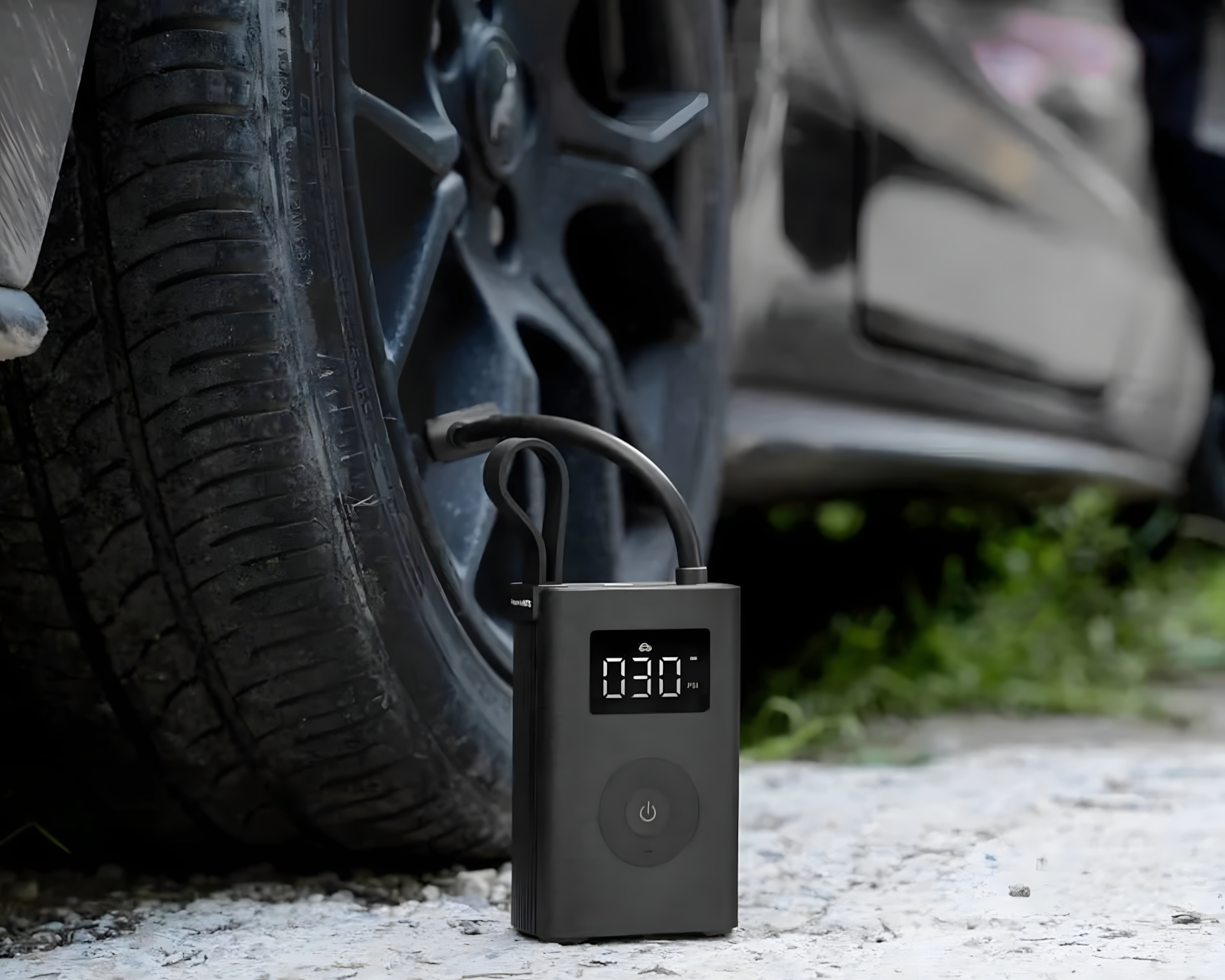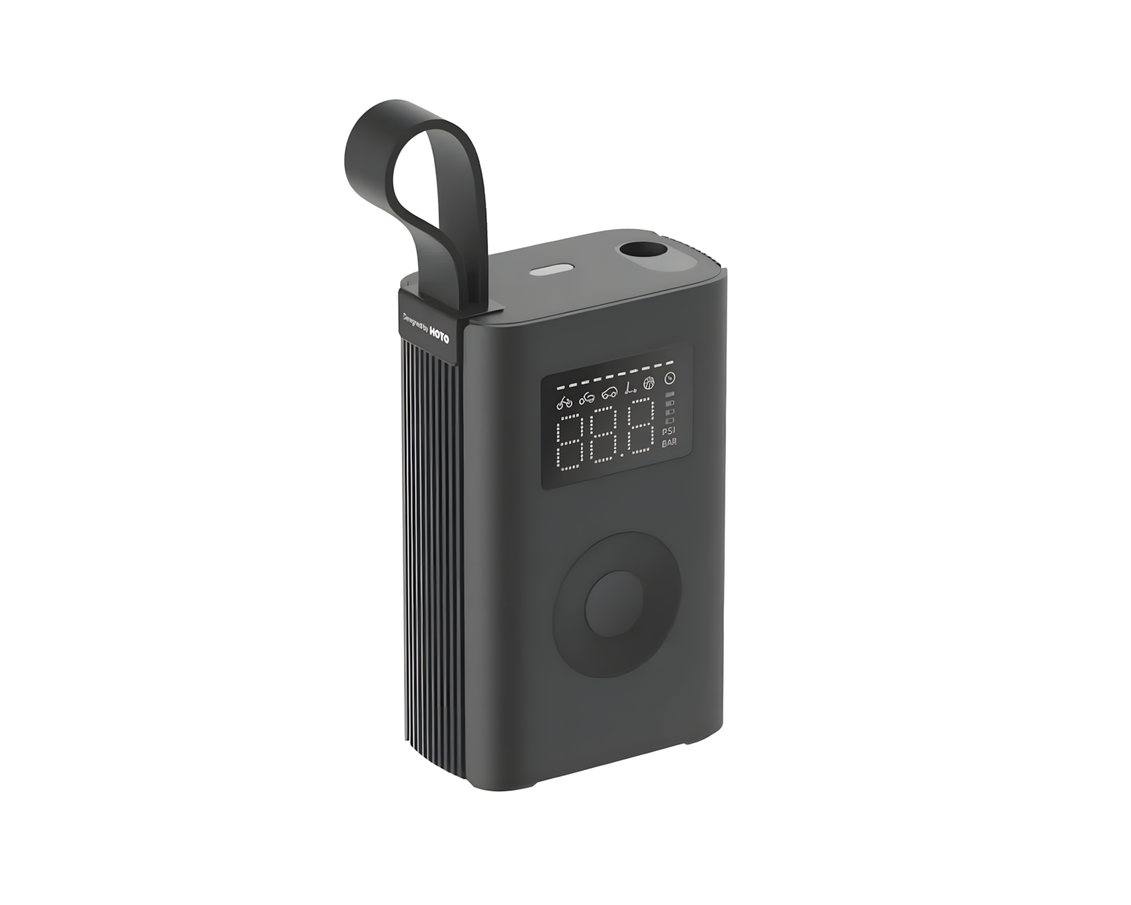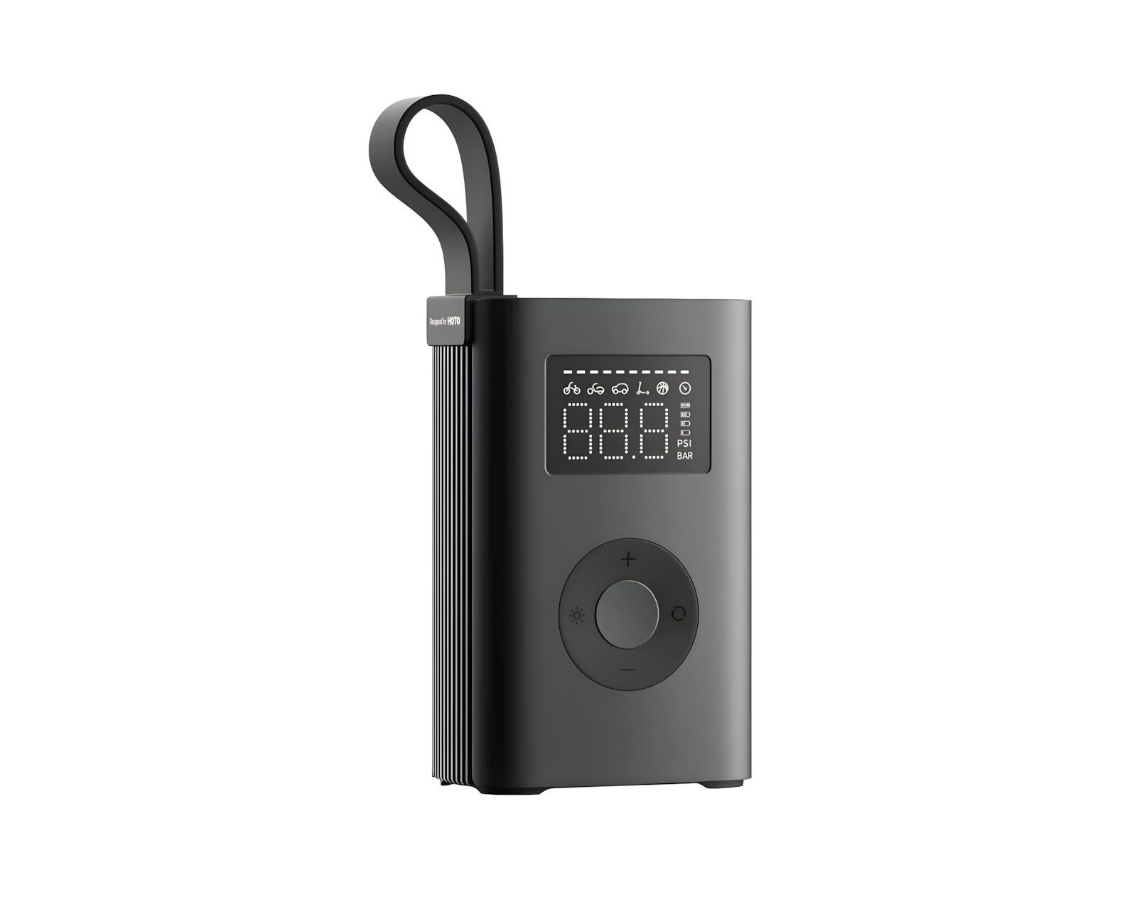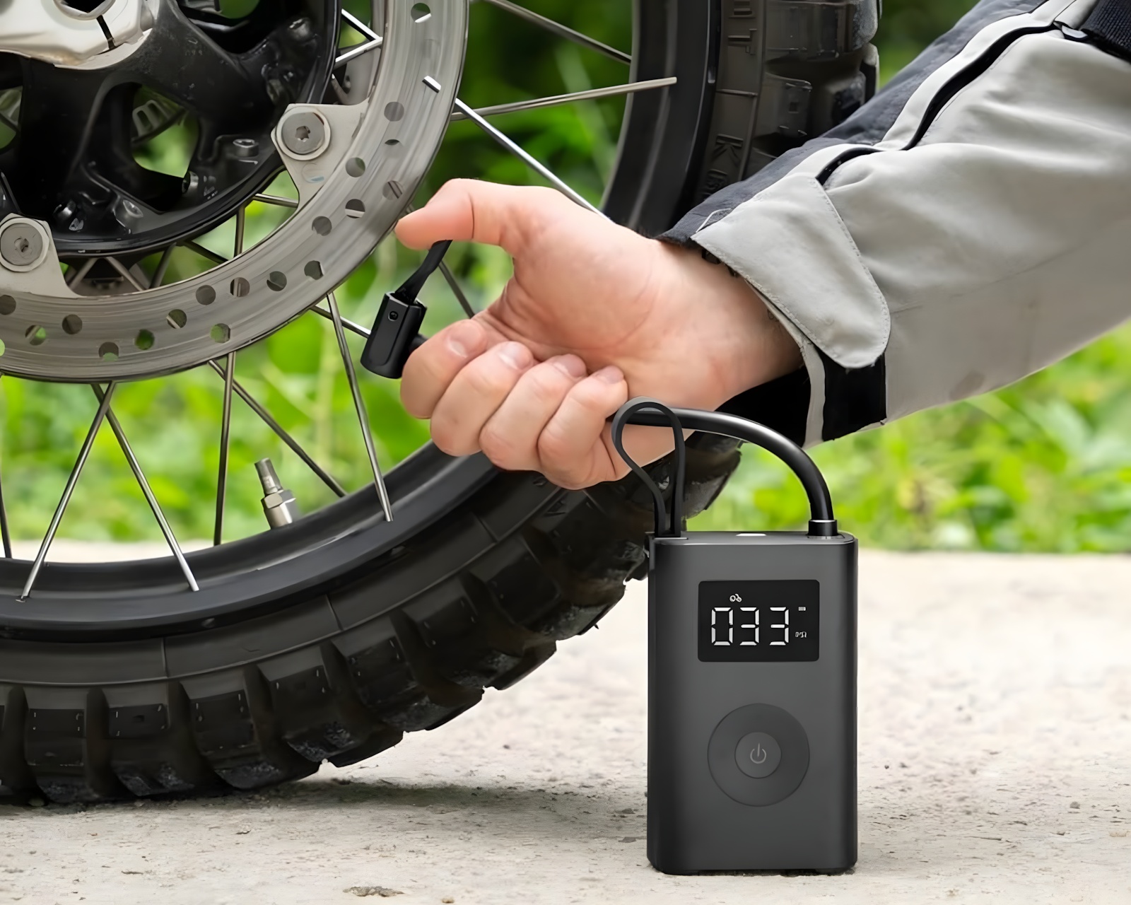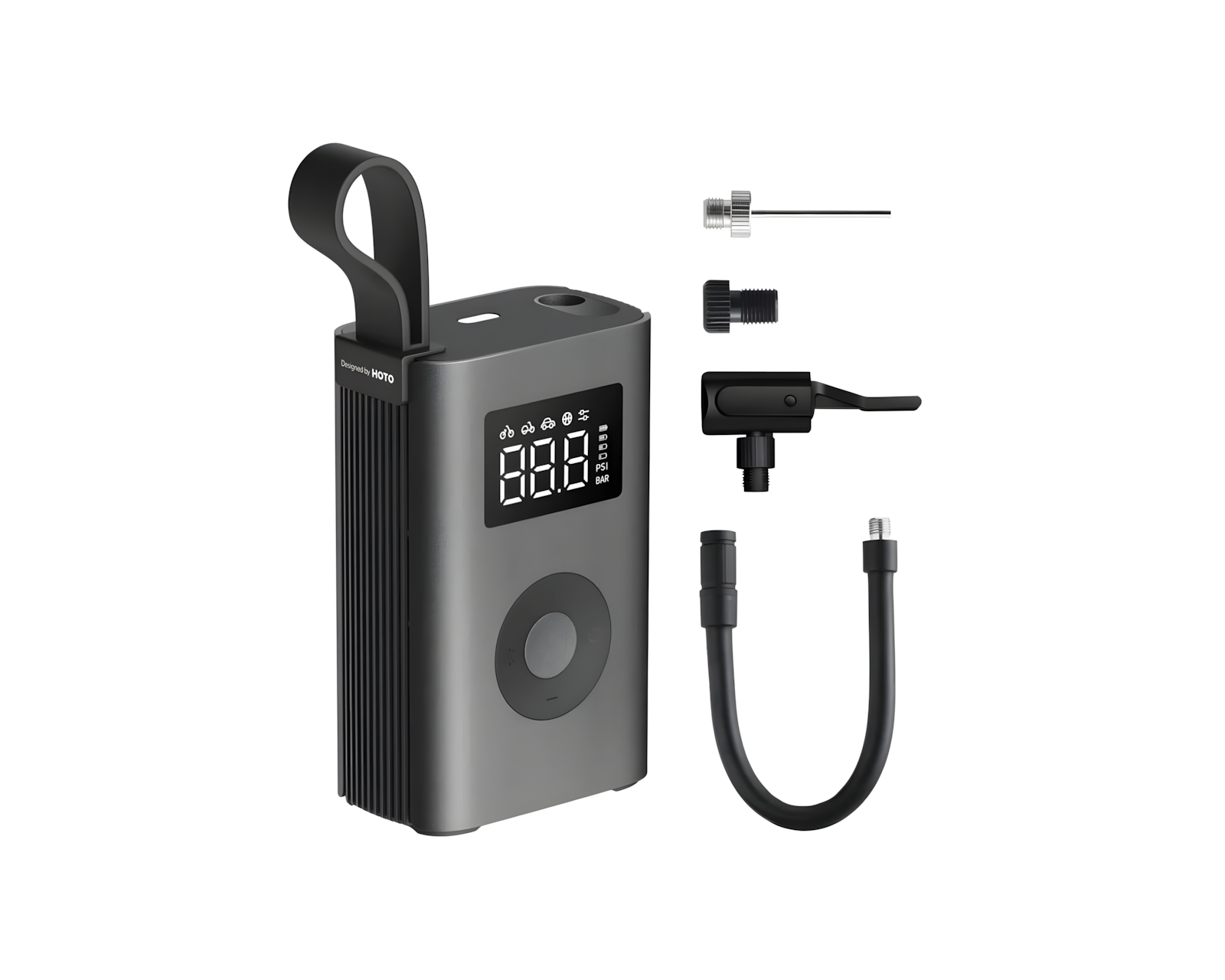 Electric Air Pump (ADV) is a compact electric air compressor from HOTO, designed to inflate tires for bicycles, motorcycles, and cars. It features a digital pressure adjustment ranging from 3 to 150 psi and automatically shuts off at the set pressure. The pump also remembers the last setting for next use.This air pump can be used for road bikes, e-bikes, motorcycle tires, car tires, balls, and other inflatable objects. It is equipped with a built-in lithium battery that provides enough power to inflate multiple bicycle and car tires and charges quickly via USB-C. A small indicator shows the charging status. The package includes Schrader, Presta, Dunlop, and needle valve adapters, as well as a high-pressure air hose and a storage bag.