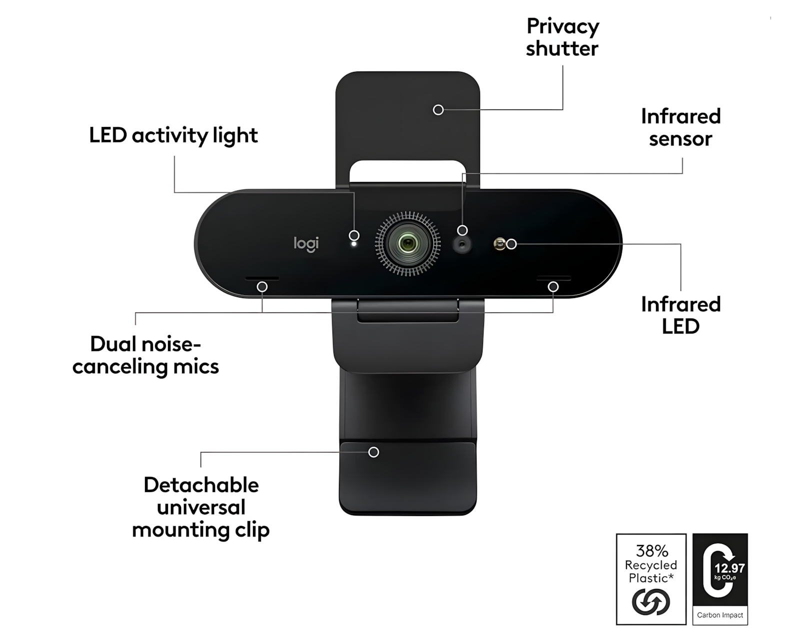 BRIO 4K is a professional webcam from Logitech that offers exceptional video quality and is designed for business use. With a resolution of up to 4K at 30 fps, autofocus, and 5x digital zoom, it ensures that every video conference is clear and detailed. It also supports Windows Hello for secure login via facial recognition.The webcam body is made from low-carbon aluminum, providing a sustainable construction while minimizing environmental impact. With advanced RightLight 3 technology, exposure is automatically adjusted to guarantee optimal image quality, regardless of lighting conditions. Additionally, it features dual omnidirectional microphones with noise reduction that capture sound clearly from a radius of up to 1.2 meters, making it ideal for professional calls. The webcam is certified for Zoom and Google Meet, allowing for easy integration with common meeting software.