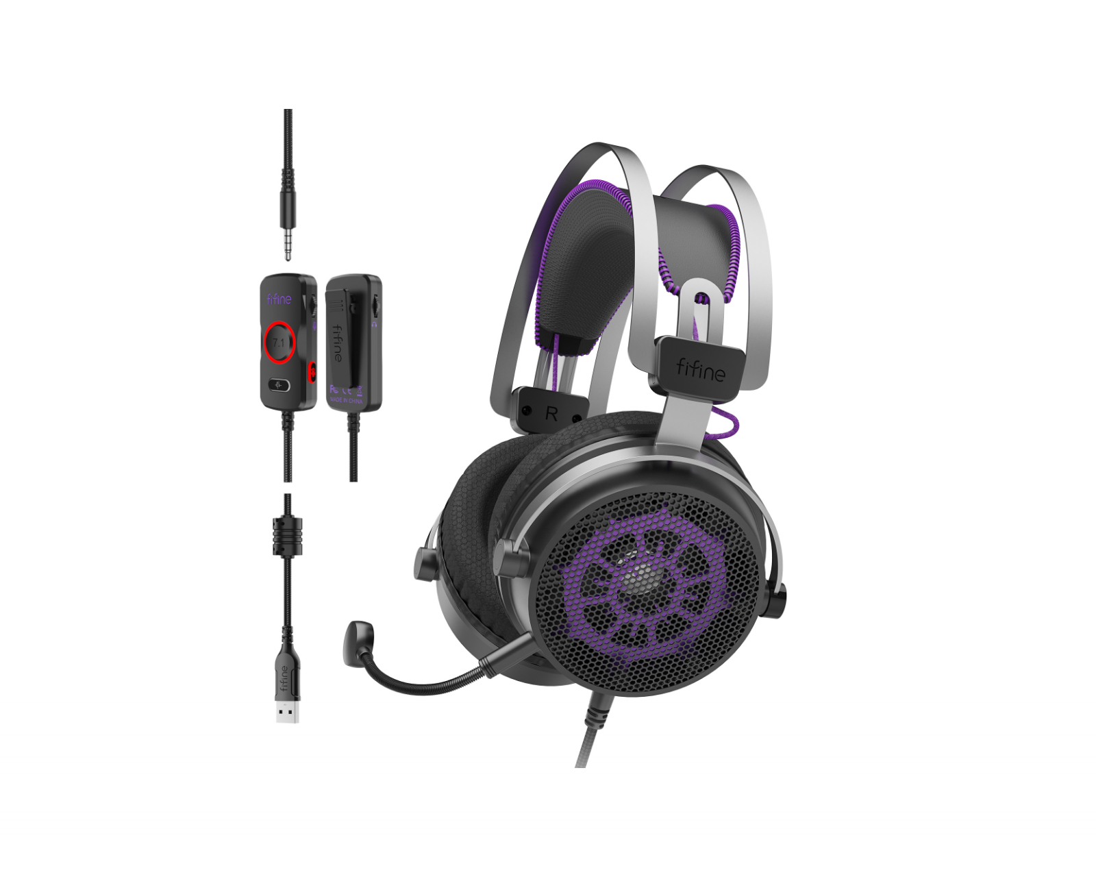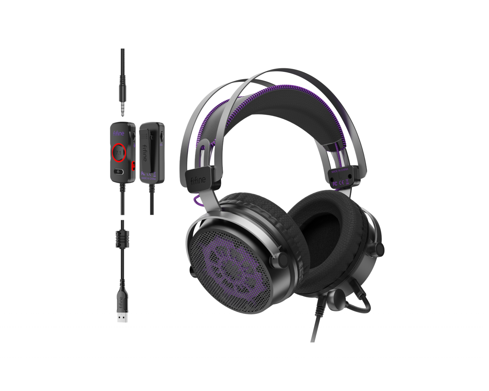 FIFINE H18V is a gaming headset from Fifine that offers an open acoustic design and high-quality 53 mm drivers for superior sound reproduction. This headset is designed to give gamers a tactile advantage during gameplay, focusing on sound details that can determine the outcome of a match. Key features include a detachable microphone that ensures clear communication and an ergonomic adaptive headband for long-lasting gaming sessions.The build quality of the H18V is optimized for comfort and durability, with a lightweight design and a double-layer in the headband that ensures an even weight distribution. The extra thick foam ear cushions are both soft and ventilated, contributing to a pleasant feel during long gaming sessions. The included USB control allows for quick adjustments to volume and microphone sound, making it easy to stay focused during intense moments. With a 3.5 mm jack and USB-A connection, the headset can be easily connected to multiple platforms such as PC, PlayStation, and Xbox.