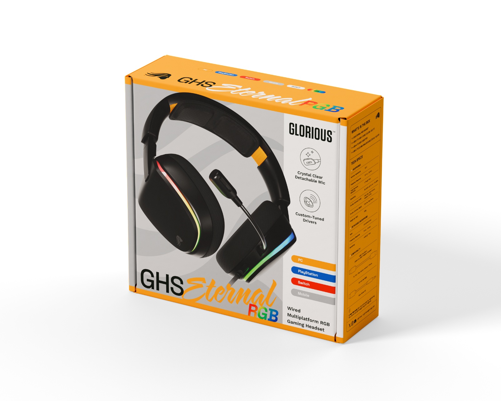 Glorious GHS Eternal RGB is a wired gaming headset from Glorious, designed to deliver a high-quality audio experience and comfort during long gaming sessions. It features custom angled drivers to provide a balanced sound profile and a detachable microphone that ensures clear communication. It connects via USB-C and 3.5 mm jack and is compatible with several platforms including PC and Xbox.The build quality of the GHS Eternal RGB is high, with reinforced materials that protect against intense use and provide extra durability. The headset has memory foam ear cushions and adjustable ear cups which contribute to comfort during extended use. The built-in volume control and mute button are easily accessible and make adjustments during gameplay smooth. RGB lighting can be customized through the Glorious CORE software, allowing you to match the headset with your gaming setup.