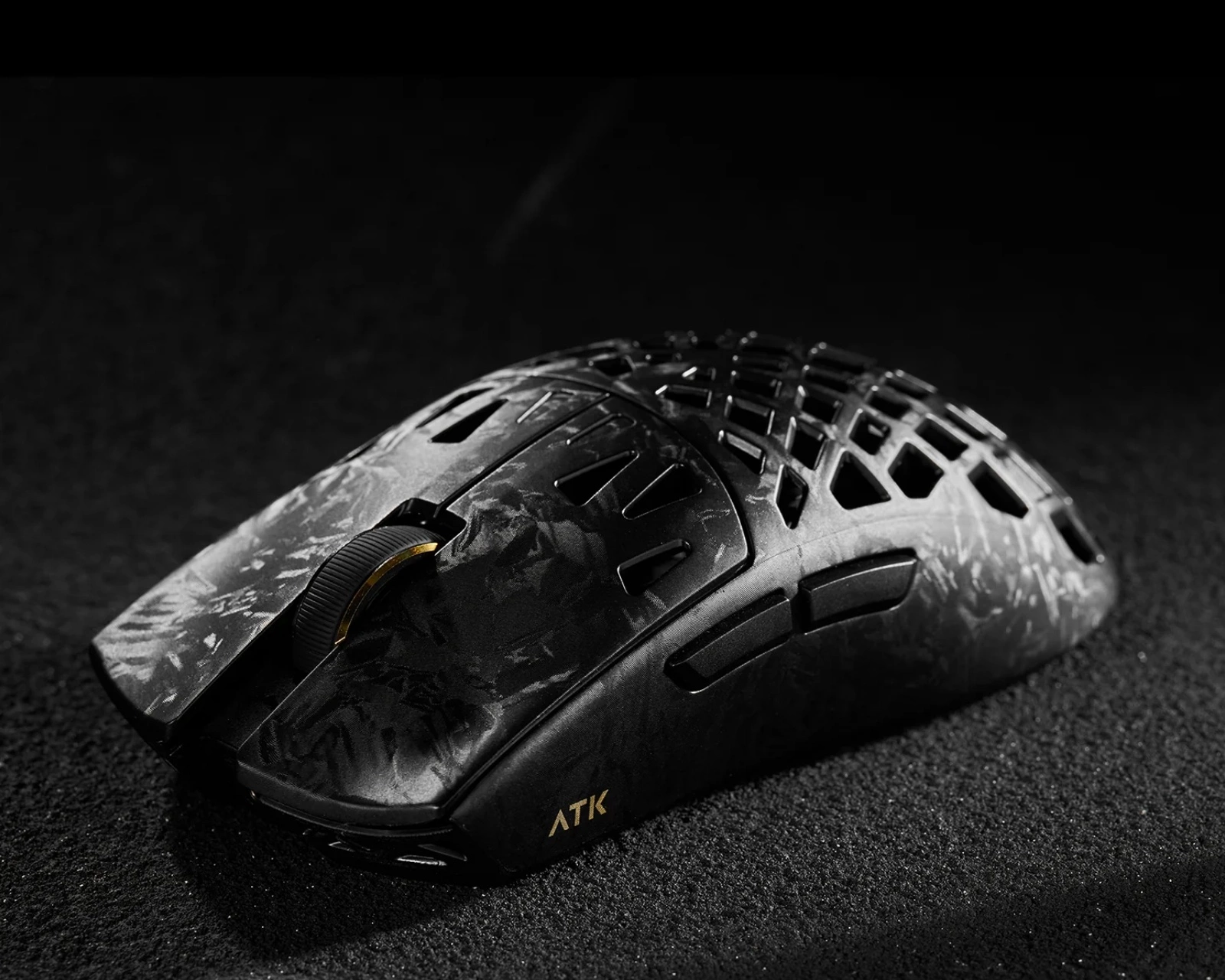 GHOST Ultimate Wireless Gaming Mouse is a gaming mouse from ATK that offers a high-performance wireless solution. It is based on a hollow construction with carbon fiber composite material, providing superior build quality and feel. Designed for medium to small hands and optimized for all grip styles, GHOST offers a comfortable and intuitive experience for gamers.The mouse weighs only 48±3g and has precise dimensions of 121mm x 61.3mm x 38mm, contributing to its lightness and maneuverability. It uses the PAW3950 Ultra sensor and measures polling rates in the range of 125-8000Hz, making it extremely responsive. Equipped with a new nano coating, it offers both grip and durability.