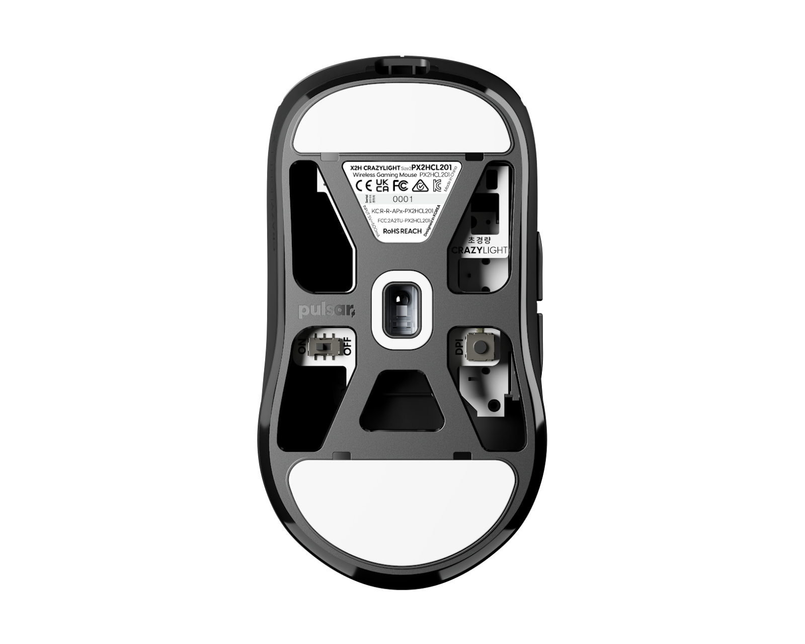 X2H CrazyLight Medium Wireless Gaming Mouse is a wireless gaming mouse from Pulsar that features a symmetrical design and a weight of only 45 grams. It is specifically designed for gamers who use claw or palm claw grip, characterized by its high hump and narrow waist. The mouse has a new sensor, XS-1, which provides high precision and responsiveness in games.The optical Pulsar switches are designed to withstand 100 million clicks, ensuring long-lasting durability and reliability during intense usage. The included 8K dongle allows for high speed and minimized latency. The mouse is constructed to provide a good grip and comfort even during longer gaming sessions. The bottom is equipped with dot skates for improved glide capability.
