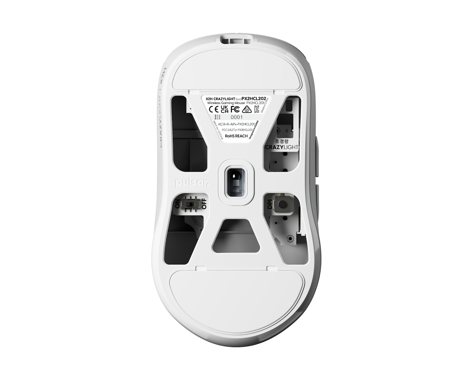 X2H CrazyLight Medium Wireless Gaming Mouse is a wireless gaming mouse from Pulsar that offers a symmetrical design and a weight of only 45 grams. It is specifically designed for gamers who use claw or palm claw grips, characterized by its high hump and narrow waist. The mouse features a new sensor, XS-1, which provides high precision and responsiveness in gaming.The optical Pulsar switches are designed to withstand 100 million clicks, ensuring long-lasting durability and reliability during intense use. The included 8K dongle allows for high speed and minimized latency. The mouse is constructed to provide a good grip and comfort even during longer gaming sessions. The bottom is equipped with dot skates for improved glide ability.