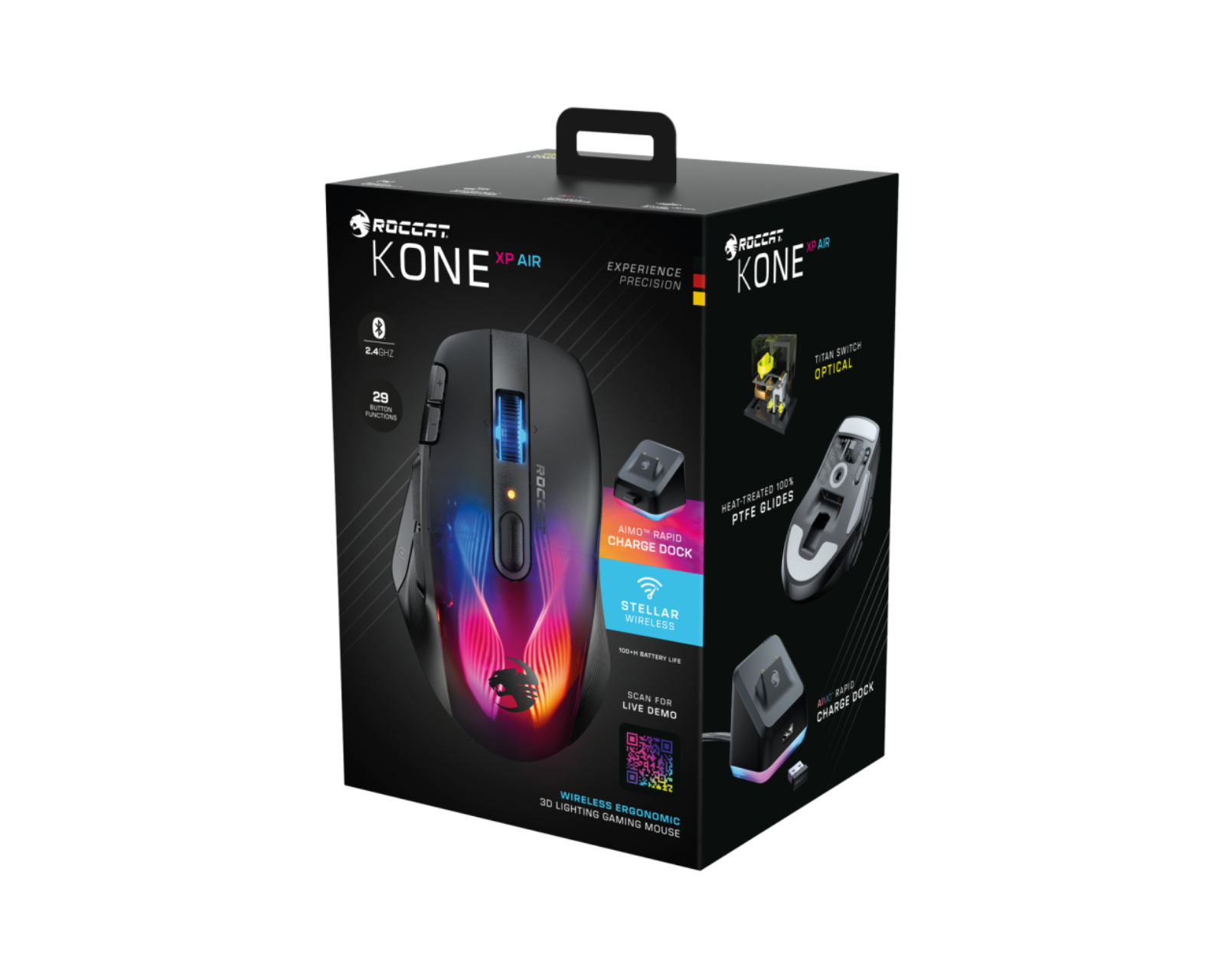 Discover the Turtle Beach Kone XP Air Wireless Gaming Mouse ? the ultimate mouse for gamers seeking both comfort and performance. With its ergonomic design and advanced Owl Eye sensor with 19,000 DPI, you get precise and smooth movements in every game moment. Five dynamic RGB zones with the AIMO lighting system add color and life to your gaming experience, while the PTFE-equipped feet ensure smooth and responsive movements.The mouse offers 10 programmable buttons including EasyShift[+] to customize commands to your play style. Choose between wireless or wired connectivity when needed. The Kone XP Air combines functionality, precision and unique lighting effects to enhance every session.