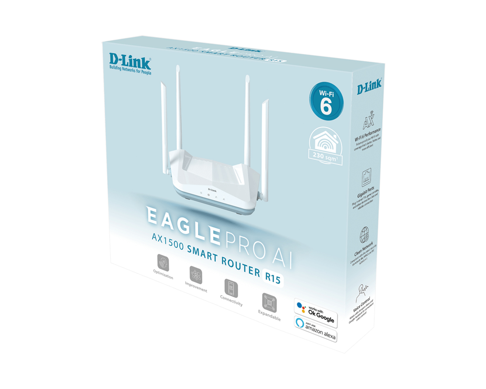 EAGLE PRO AI AX1500 Smart Router is a router from D-Link that offers advanced Wi-Fi technology with support for Wi-Fi 6. This router has a total data rate of 1500 Mb/s, divided between 1201 Mb/s on 5 GHz and 300 Mb/s on 2.4 GHz. The product is designed to support multiple devices simultaneously, making it suitable for smart homes where multiple users can stream, game, or work without interruptions. The router is easily managed via the EAGLE PRO AI app and includes advanced security features such as WPA3.EAGLE PRO AI AX1500 is equipped with dual-band technology, enabling an optimized network experience. With features such as MU-MIMO and OFDMA, the device can efficiently handle multiple simultaneous connections, minimizing traffic congestion. Voice control via Google and Alexa is also provided, giving users even more control over their network. The router has AI-based Mesh functionality to improve network coverage. Parental controls and traffic optimization are included to further personalize the user experience.