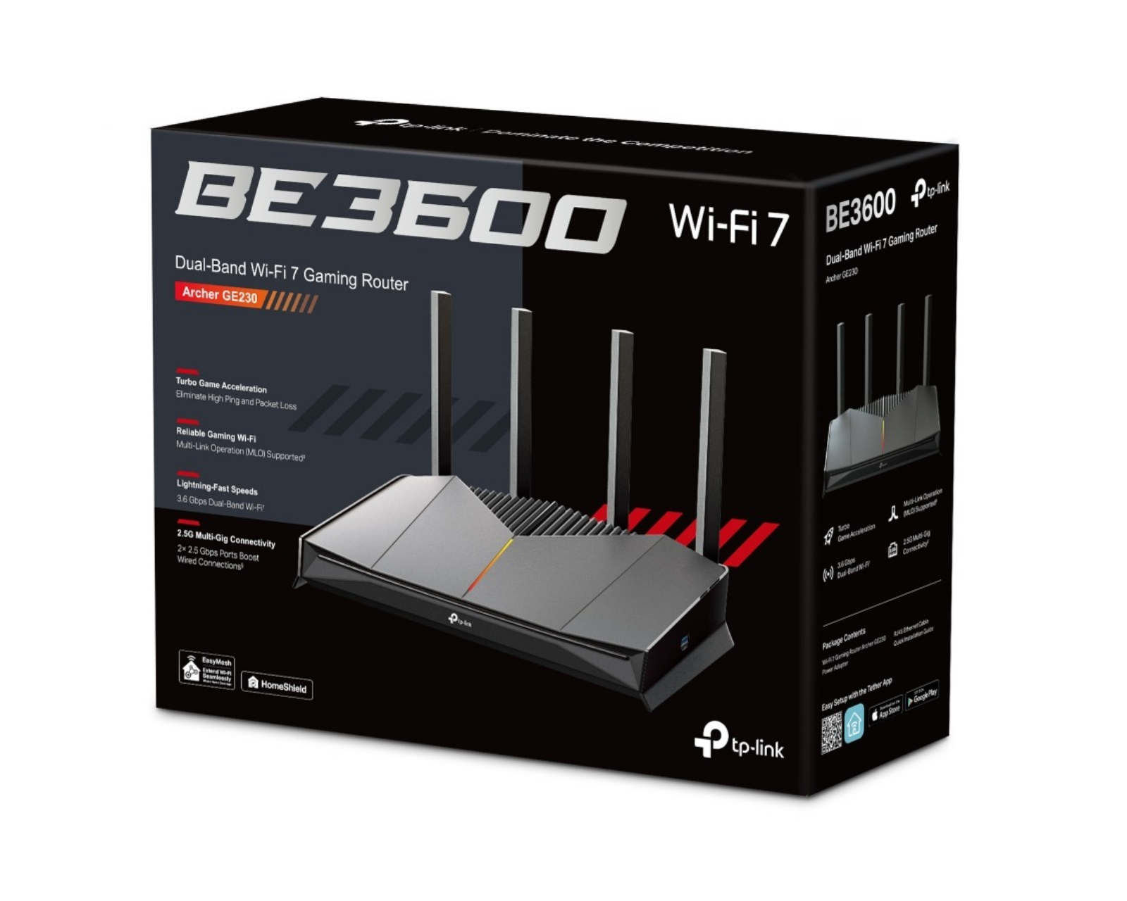Archer GE230 is a dual-band Wi-Fi 7 gaming router from TP-Link that offers exceptional speeds and performance for demanding gamers. With speeds of up to 3600 Mbps, users can enjoy fast and stable connections, significantly enhancing the gaming experience. The router also features two 2.5G LAN ports that enable faster data transfer, providing even more power for online gaming.Built to support the latest technology, the Archer GE230 has a quad-core CPU that efficiently handles multiple data streams. Multi-Link Operation (MLO) allows for parallel data transmission, reducing latency and providing a smoother experience during intense gameplay. The dedicated gaming panel provides real-time information on network status and router performance, allowing users to optimize their connection. The router also features RGB lighting in a design inspired by race cars, making it a visually appealing addition to the gaming environment. With support for TP-Link EasyMesh, the router can be easily integrated with other devices to create a seamless and reliable home network.