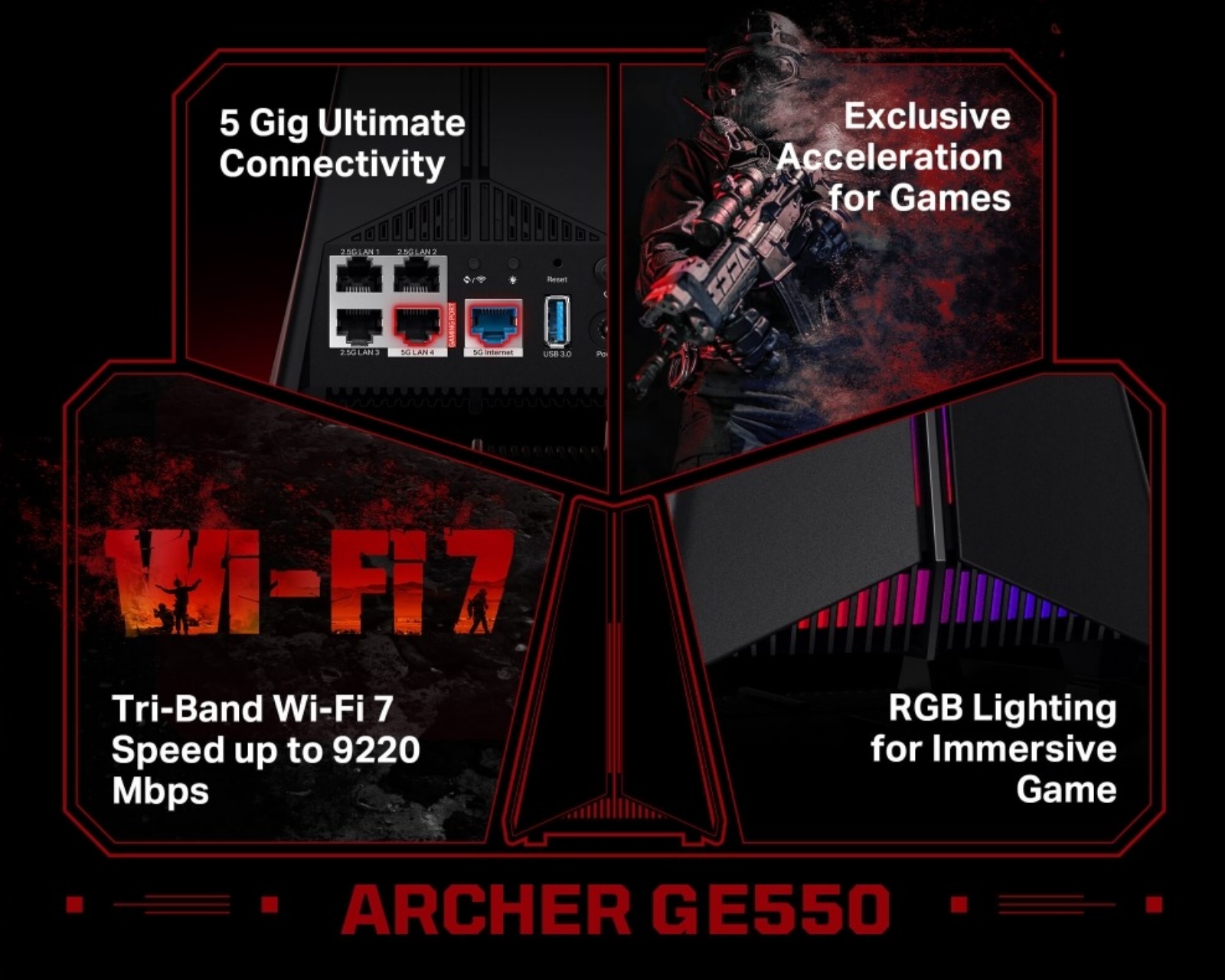 Archer GE550 is a tri-band Wi-Fi 7 gaming router from TP-Link, specifically designed to offer exceptional speeds of up to 9220 Mbps. With a 6 GHz band delivering 5764 Mbps, a 5 GHz band at 2882 Mbps, and 574 Mbps on the 2.4 GHz band, this router is designed to keep gaming sessions stable and fast. Thanks to a dedicated 5GHz band for gaming, you can enjoy low latency while simultaneously streaming or using other devices in the home.A router of this caliber must have robust internal components, and the Archer GE550 has a powerful quad-core CPU that maximizes performance during intense gaming. With support for Multi-Link Operation, you can use both 5 GHz and 6 GHz simultaneously, ensuring stable connections and fast data transfer. The router's connectivity options are also impressive, with a 5 Gbps WAN port and several 2.5 Gbps LAN ports, allowing you to connect multiple devices at the same time without compromising speed. This router also features a dedicated game panel for real-time insights, facilitating strategic gaming and providing an informative overview of network status and performance.