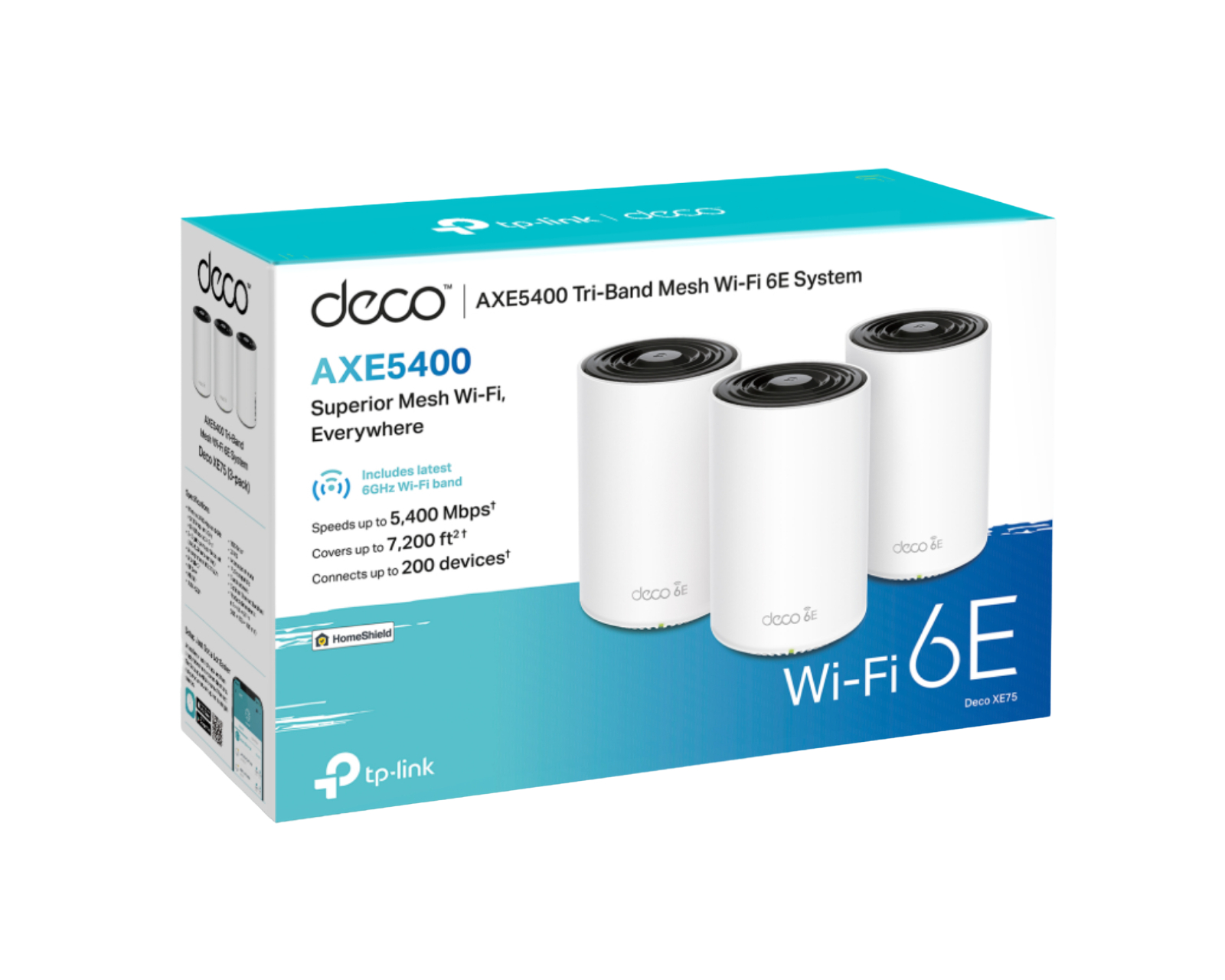 Deco XE75 Tri-Band WiFi 6E Mesh System (3-pack) is a wireless router from TP-Link that offers next-generation seamless WiFi solutions for your home. It can cover up to 650 sqm and handle speeds of up to 5,400 Mbps by combining all three WiFi bands, making buffering and dead zones a thing of the past. The Deco units connect easily and efficiently, enhancing the network experience throughout the home.Built to provide a stable connection, Deco XE75 combines advanced AI technology to optimize network performance. It is backward compatible with all previous WiFi versions, ensuring that all your devices work flawlessly, regardless of provider or modem. With TP-Link HomeShield, you also get robust protection for your home network and IoT devices. The installation is simplified through the Deco app, which guides the user step by step for a smooth experience. The wireless networking solution is specifically designed for gamers and tech enthusiasts who require higher performance and security.